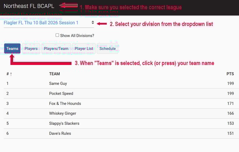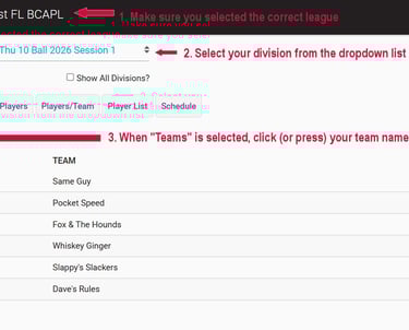 Once you click your team's name (#3 in the image to the left or below) you will be taken to the page designated as "B" below