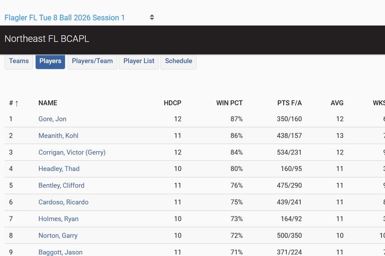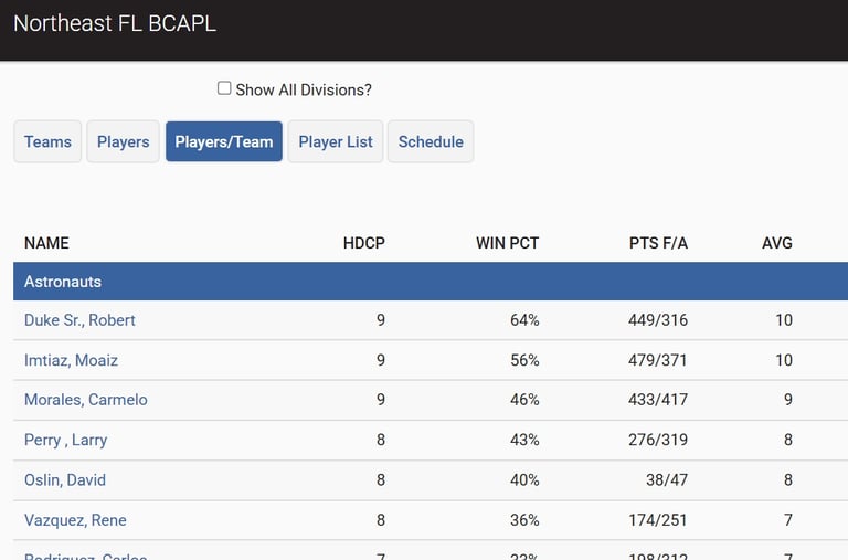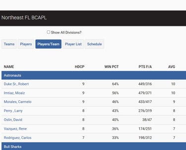The next two buttons on the site are "Players" and "Players/team". Both show pretty much the same stats but the "Players" button shows the entire league's players and are in alphabetical order.