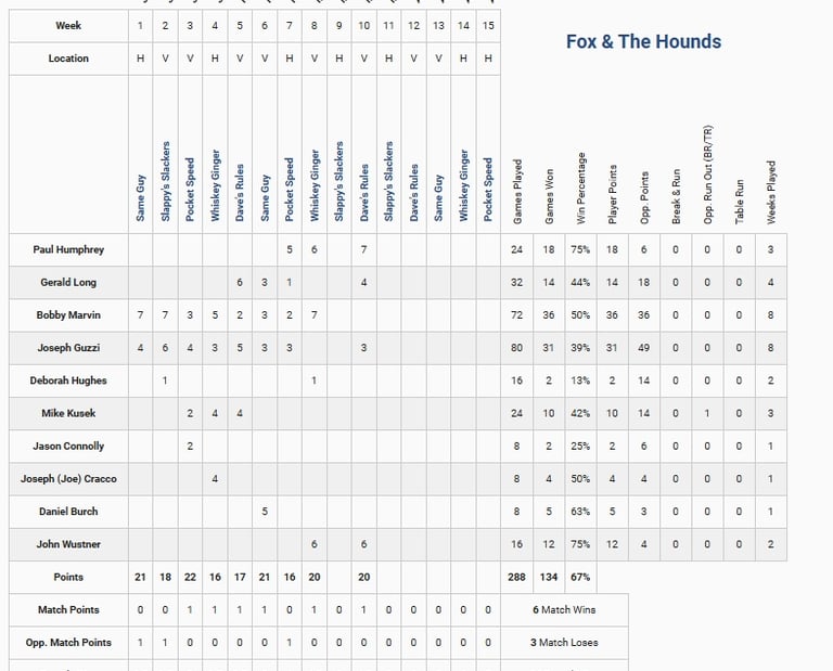 Here you will see statistics about the team broken down to individual players followed by the team's won-lost record, how many games each player has played in, and other stats.